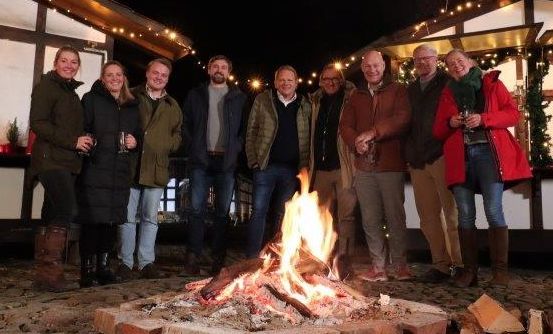 An festlicher Tafel genießen sichtlich zufrieden: Theresa Coßmann und Margarete Ribbecke, Jörg Terjung und Georg Glitz-Ehringhausen, zusammen mit den Köchen Frank Buchholz und Börn Freitag zu Gast bei Iris, Thedel und Friedrich Haver-Rassfeld.